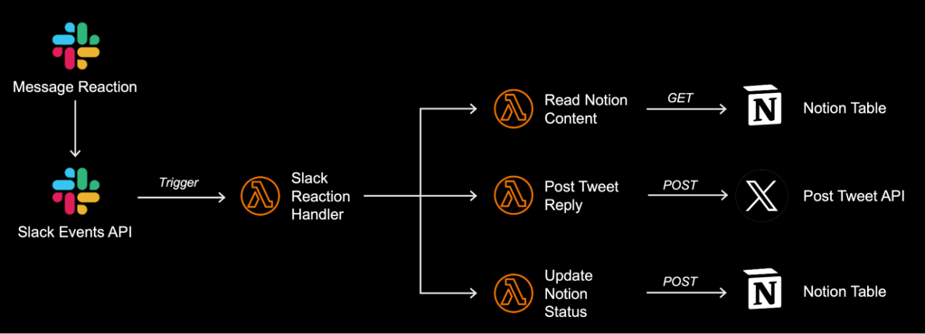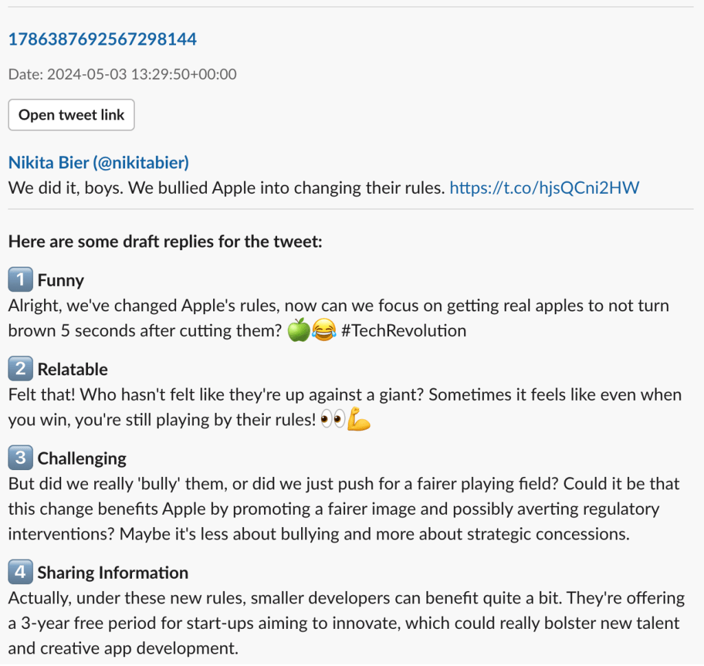 Finally, the processed tweet and draft reply are posted to a designated Slack channel, allowing users to react to the post and trigger the automated tweet reply based on their chosen reaction.