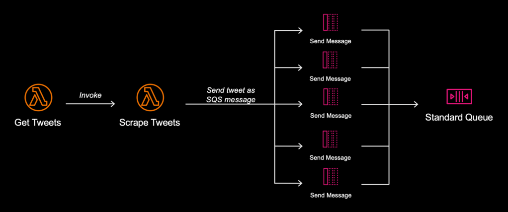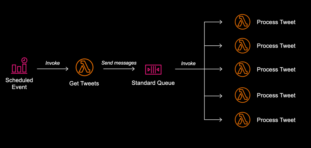 - Each retrieved tweet is then converted into an event message and published to a standard SQS queue.