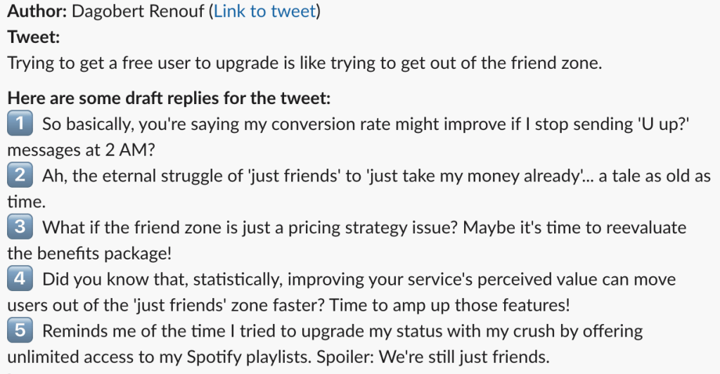 First, we prompt GPT to analyze about 10 of someone’s past tweets to understand their writing style, including word choice, sentence structure, and overall tone. This helps us grasp how they prefer to communicate. Then, based on what we’ve learned about their style and the nature of the tweet from our previous analysis (funny, question, etc.), we ask GPT to generate five different reply options: funny, relatable, challenging, informative, and personal story.