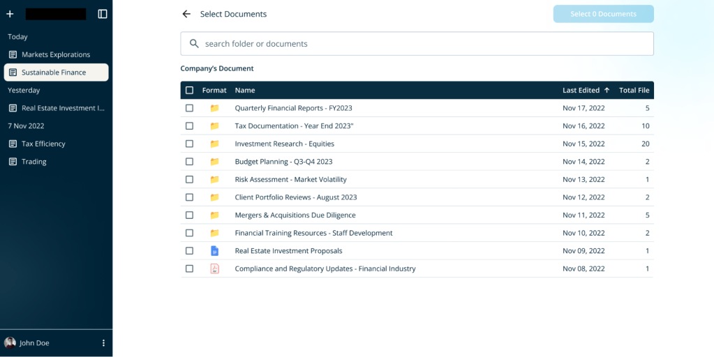 - Chat Session: Displays the chat history and a list of uploaded documents. Users can add or remove documents here.