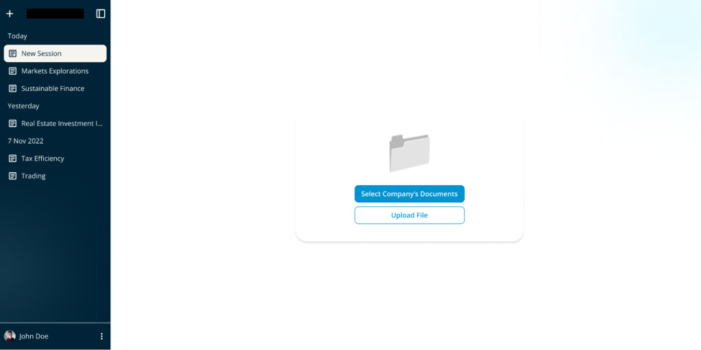 - Session Page: Users can create new chat sessions and select documents for analysis.
