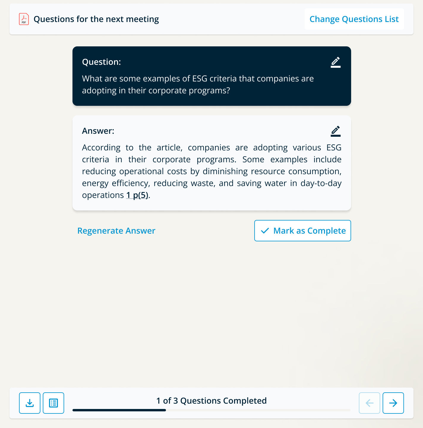 ![]() | The Questions and Answers section helps users identify which questions haven’t been answered yet. Users can also regenerate or edit answers if they are not satisfied with the current responses. |